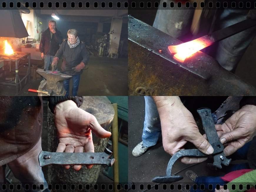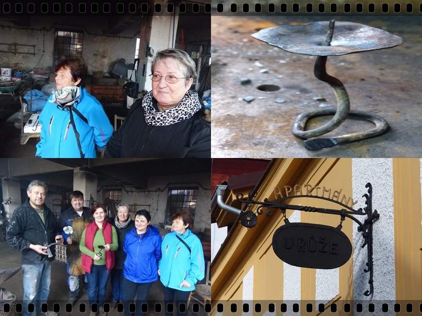 Po obědě jsme se hromadně vydaly na exkurzi ke kovářům. Jsou to kluci šikovní. „Klikař“ Peťa Voldřich nám ukázal, jak se vyrábí klika a štítek. Milenka byla jediná odvážná a na chvíli se s ním vystřídala. Martina ho nakonec svým dotazem, jestli už je to hotové, nenápadně dotlačila dodělat dílo až do konce. Viděly jsme i výrobu hřebů, kterými se klika na dveře přibije. Druhý kovář Míra Kudrna koval růži. Z pár kousků plechu, chvilky nahřívání v ohňové výhni, tvarování a následném namočení ve vyjetém oleji.... No nestačily jsme se divit, jaká nádhera vznikla. A hlavně to byla recyklovaná nádhera!!! Přesně náš styl ;) A ještě si pro nás připravili jedno překvapení, takovou malou hádanku. Kousek tyče, kousek plechu, chvíle nahřívání, ohýbání, kování a na světě byl nádherný svícen :) Hoši mají náš obdiv, že v tomto prostředí dokáží vydržet. My jsme se chvílemi dusily, protože se zatápí černým uhlím, které se předem máčí ve vodě, aby bylo výhřevnější. Na dýchání nic moc ;)