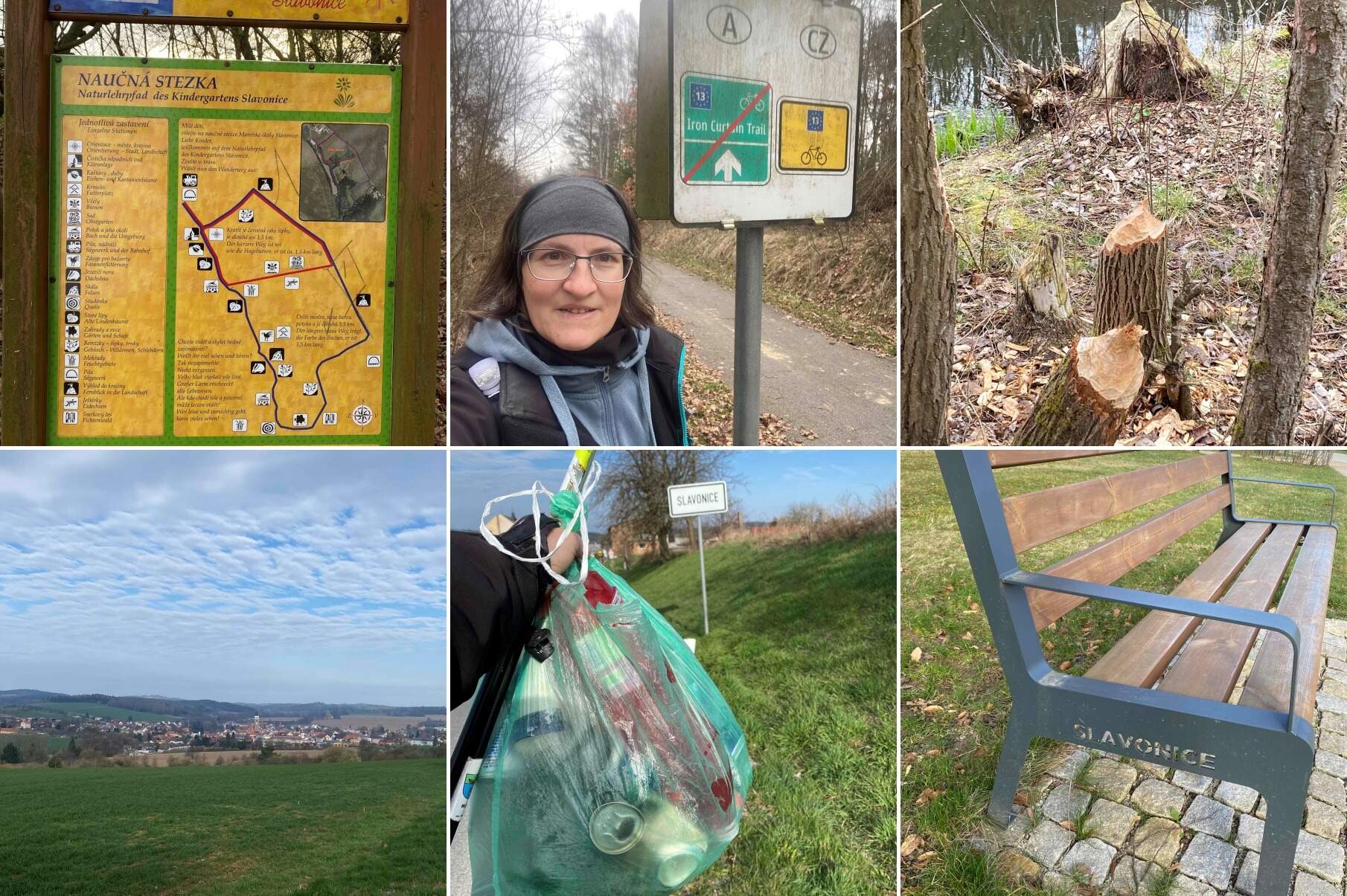 Ve čtvrtek jsem si zapomněla vypnout budík. Takže když už jsem v 6 ráno vstala a do okna svítilo sluníčko, vydala jsem se na zdravotní procházku. Došla jsem „až“ do Rakouska. Zkontrolovala jsem část naučné stezky místní mateřské školy, kterou s dětmi budovala Víťa a její kolegyně, pokračovala jsem přes potok k cyklostezce. Ta vznikla před pár lety vytrháním železniční trati, vede až do Waidhofen an der Thaya a měří skoro 30 km. Já jsem došla jen k hranici a odsud pokračovala podél rybníka, kde řádí bobři a kudy vede část jihočeské Stezky Českem. Vyšla jsem nad Slavonicemi a po silnici sešla k městu. Cestou jsem sbírala odpadky a byla jsem překvapená, kolik plechovek, PETek a všemožných obalů se povaluje všude kolem L