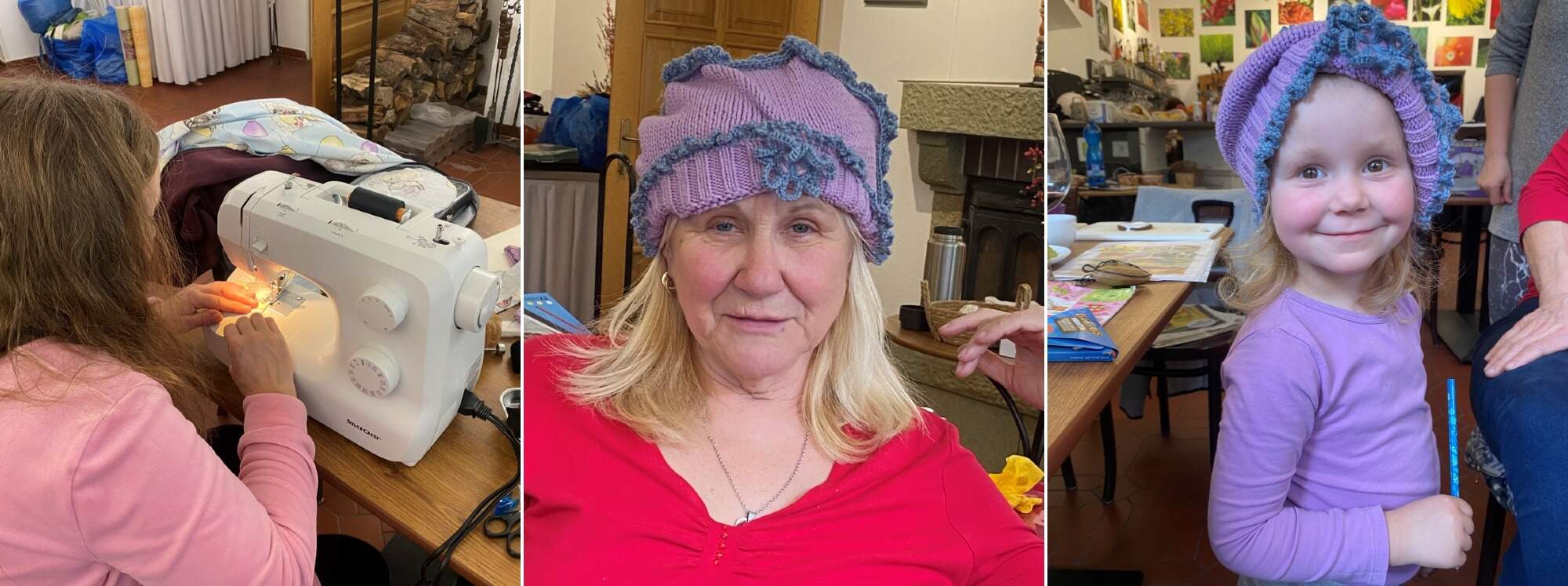 Po návratu do hotelu jsme se opět vrhly na tvoření. A Mia je opravdu neskutečná. Dovezla polorozpáraný svetr a z rukávů vyrobila dvě naprosto originální čepice. Jednu pro Víťu na přehlídky s tančírnou a druhou pro Věrčinu malou pomocnici. První se totiž Věře líbila tolik, že ji chtěla od Mii koupit a té to nedalo a hned se pustila do výroby menší čapky. A těch čepic vyrobila víc. Ze starých šatů, ze sukně... Kouzelnice.