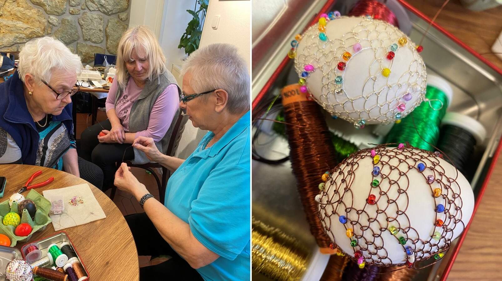 Hanka mezitím ukazovala tajemství výroby děrovaných drátovaných kraslic s korálky. Prozradila nám, že před vyfouknutím do vajíčka naťukne malou dírku a tu propiluje kulatým pilníčkem, aby skořápka kolem dírky nerozpraskala. Vajíčka poté vyfukuje klystýrovým balónkem. Poté je vykoupe v Savu, aby odstranila blánu a po uschnutí natírá vodouředitelným lakem a případně barví spreji na lakování aut. Pak už jen stačí vajíčko odrátovat a originální skvost je na světě. Hanka měla ale trumfů v rukávu vícero. Ukázala nám, jak vyrábí stáleplodící a neopadavé šípky, trnky a pámelník. Radost pohledět.