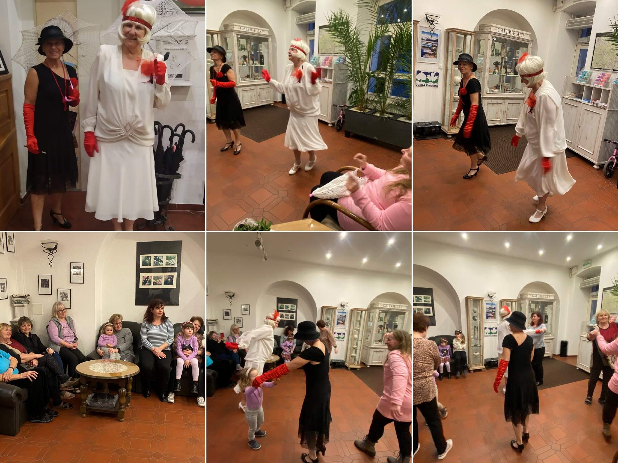 Navečer si pro nás Víťa připravila malé překvapení. Se svou kolegyní z tančírny nám zatančily pár tanečků v prvorepublikových kostýmech na dobovou hudbu. Nádherný zážitek. Poslední písnička byla pozvánkou k tanci a pár tanečnic se opravdu našlo a zatancovalo si. To byl tanec J