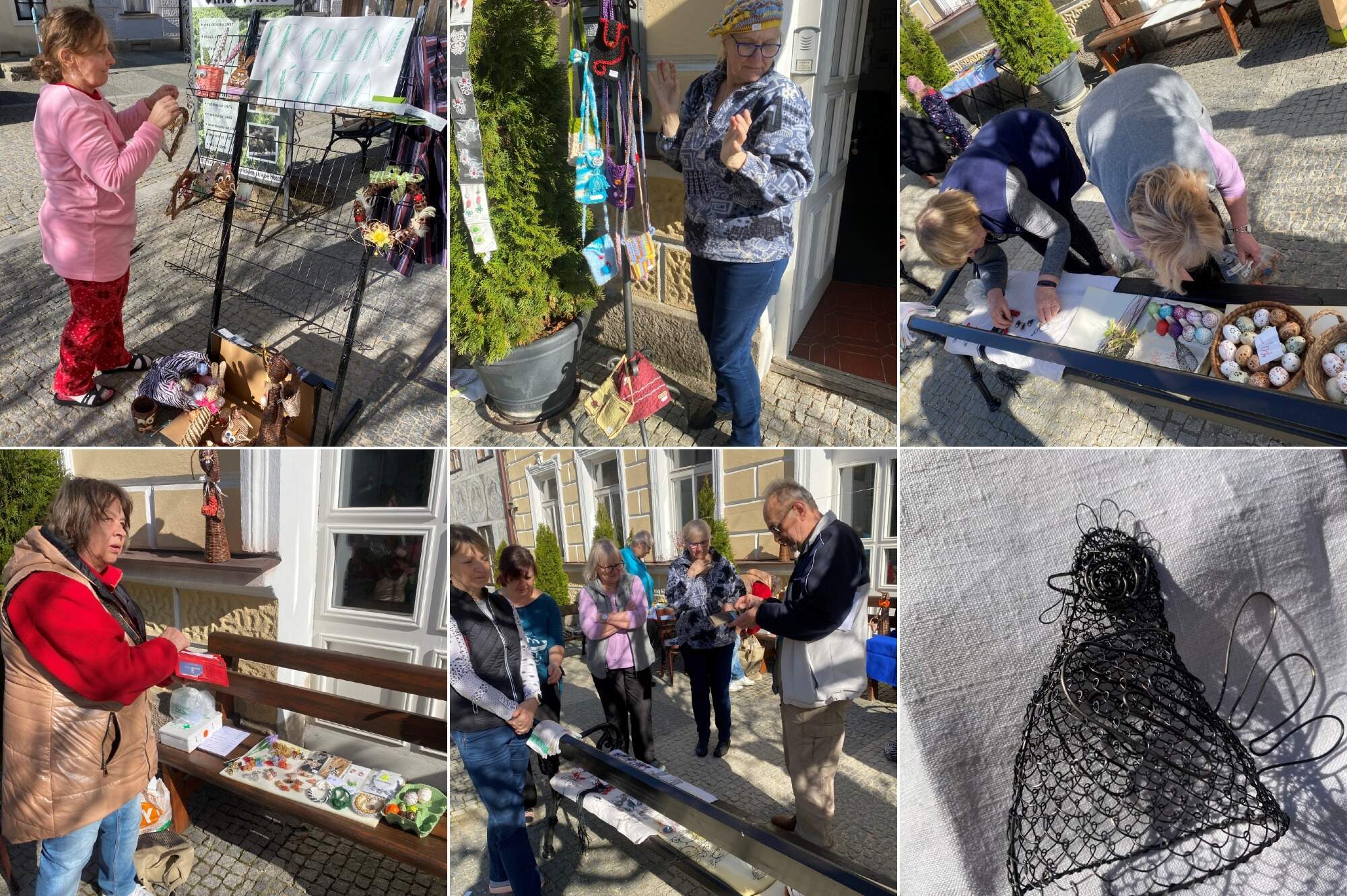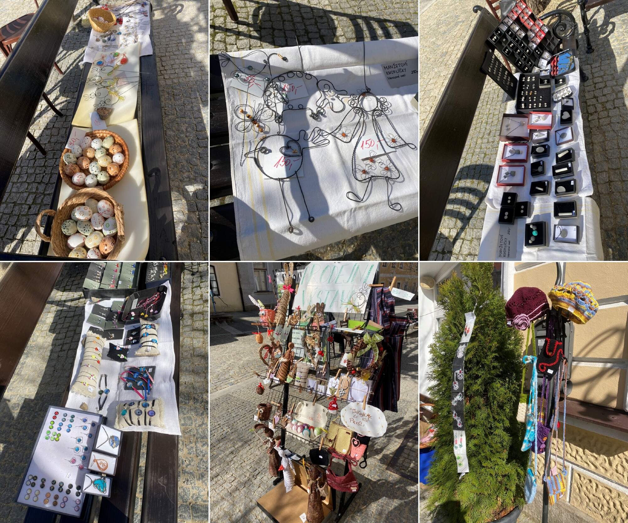 Asi po hodince, když jsme z keramické dílny odcházeli, jsme se nestačili divit změně počasí. Z okna jsme viděli jen silnější vítr, ale ze dveří, které vedou na druhou stranu jsme zahlédli úplně černé nebe, ze kterého zanedlouho začal pršet. Proto museli v Růži uklidit výstavu do vnitřních prostor, aby nám nelítali andělé a velikonoční zajíci po náměstí :D