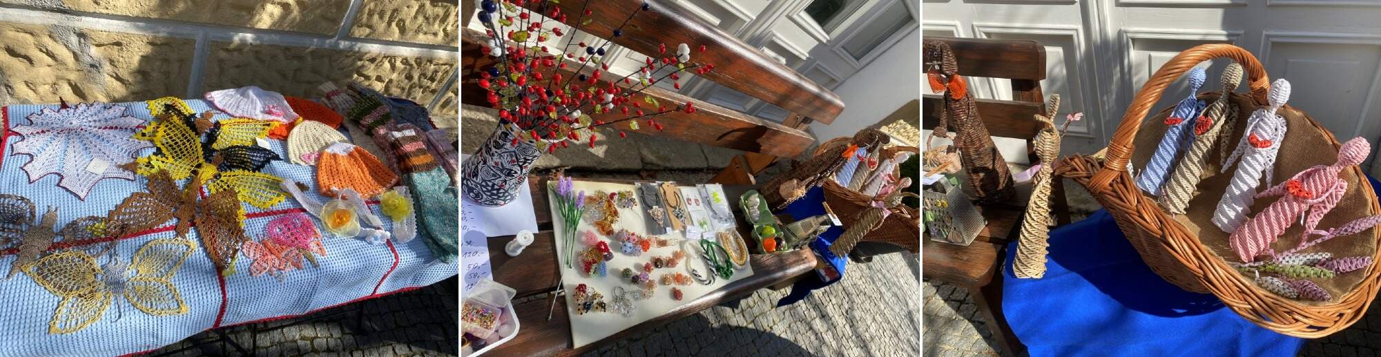 I v sobotu nás z postelí vytáhlo sluníčko. Venku bylo na krátký rukáv a my jsme začali chystat prodejní výstavu našich všemožných výrobků. Využili jsme lavičky, stojan z hotelu, stolečky, věšák, prostě my si umíme poradit za všech okolností :D Před Růží jsme vytvořili galerii pod širým nebem. První výrobek prodala Mia, která se ani nestihla převléct z pyžama, protože od brzkého rána seděla u šicího stroje. Dál to rozvádět nebudu, protože my víme, co měla a neměla na sobě... :D