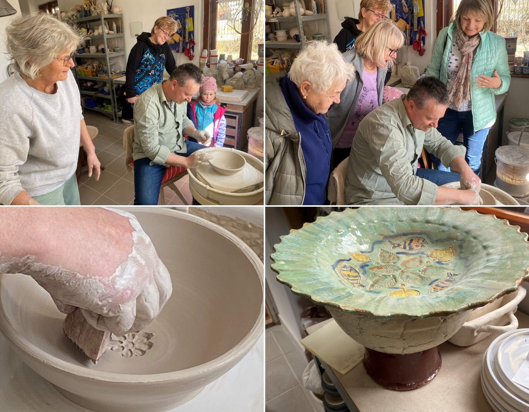 Péťa byl na dopoledne objednaný na keramiku k Terezce, tak jsem vzala nováčky na exkurzi a při točení na kruhu byl pod bedlivým dohledem. Vytočil si dvě misky a z minulého točení na něj čekalo nádherné pítko pro ptáky ze kterého možná nakonec bude interiérová mísa, protože se opravdu povedlo/a. Nádherná práce.