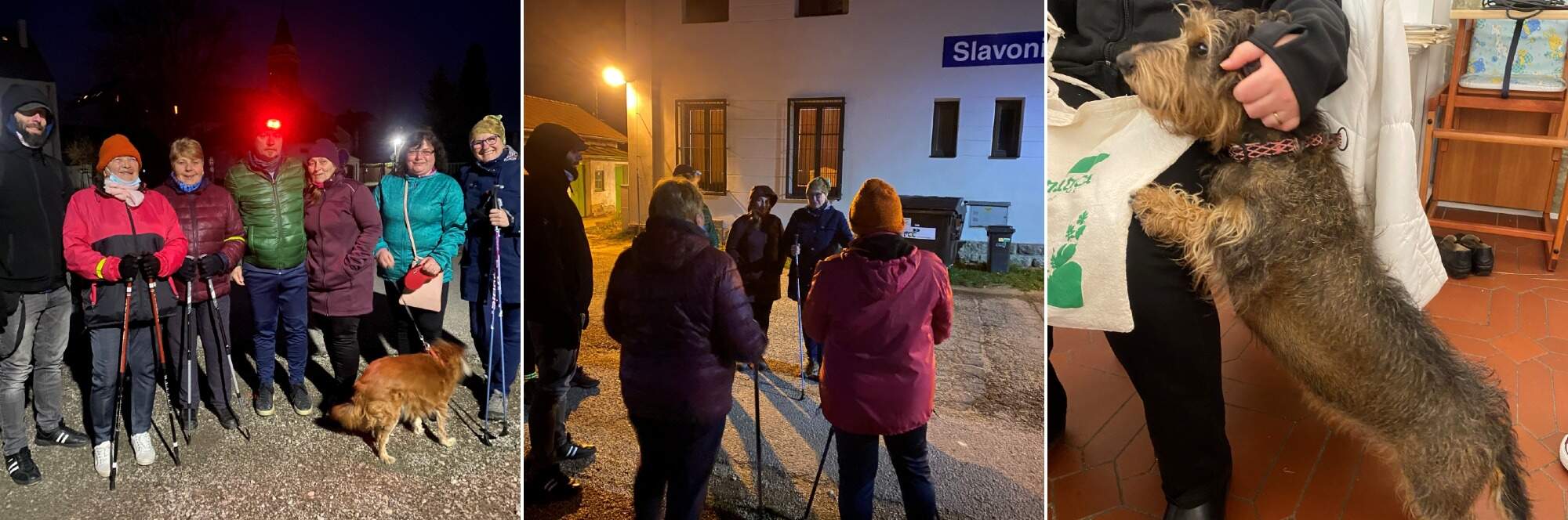 Na sedmou byl naplánovaný tradiční slavonický úplňkový výšlap, přestože úplněk měl být až v pondělí. Víťa má tolik aktivit a povinností, že musela úplněk posunout právě na sobotu. A díky tomu jsme s našimi Slováky mohli vyrazit taky J Od hasičárny jsme kolem nádraží došli na kopec směr rakouský Fratres, na kopci odbočili směr Kadolec a poté se z hlavní silnice uhnuli dolů k Bejčkovu mlýnu. A protože jsme s sebou měli fenku Šklíbu, u Bejčkova mlýna s k nám přidala místní fenka drsnosrstého jezevčíka, která s námi došla až do Růže. Odtud Víťa zavolala majitelce, která je shodou okolností i provozní „našeho“ hotelu a ta si pro notorickou útěkářku dojela.