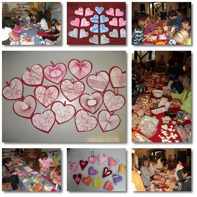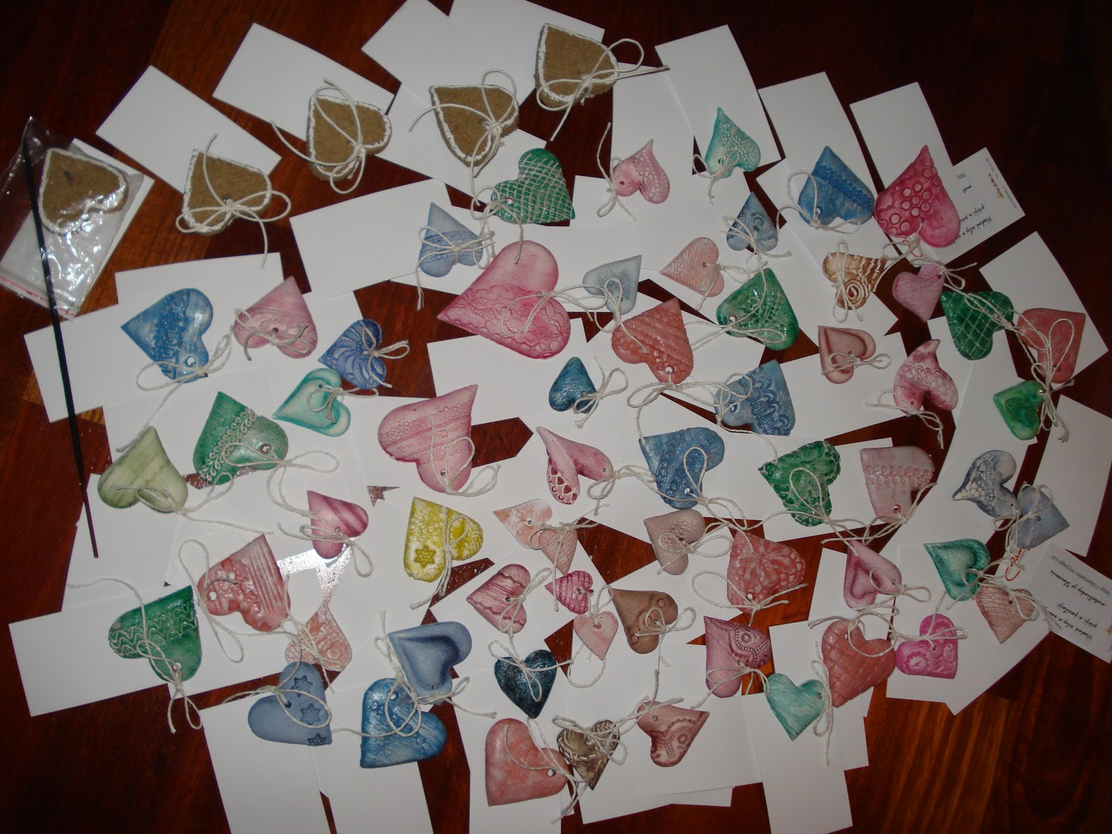 10 srdíček motaných papírových a 65 keramických srdíček vyrobily společně s maminkami z MC Medvídek účastnice srazu papírového pletení ve Slavonicích.